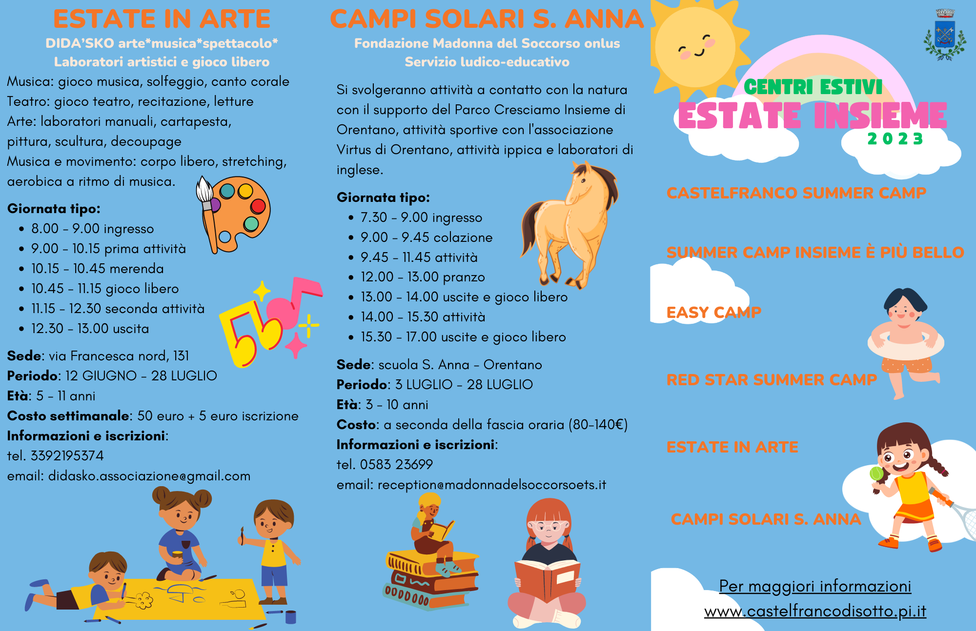 Al fine di coordinare le attività dei centri estivi, il Comune di Castelfranco ha promosso la costituzione di una rete di tutti i soggetti (Rete Estate Insieme) che operano sul territorio comunale e condividono obiettivi e impegni